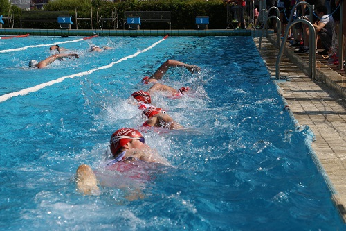 10:45 Uhr erklang dann die Start-Tröte für die Männer. Es mussten 750 m geschwommen, 20 km geradelt und 5 km gelaufen werden. Das Schwimmen wurde im Freibad auf einer 50 m Bahn absolviert. Jedes Team startete für sich, das heißt nach jeweils einer Minute erfolgte der Start des nächsten Teams. Die Reihenfolge der Starts setzte sich nach der Gesamtplatzierung der vergangenen Saison zusammen. Unsere Männer hatten sich im Schwimmen super platziert und konnten bereits nach 11:20 min den Wechselgarten verlassen und gemeinsam auf das Rad springen. Erst auf der Radstrecke konnte ein Starter ‚verloren‘ gehen, falls ein Defekt am Rad oder dann doch die Müdigkeit einsetzte. Gleiches galt natürlich auch für die Frauen.