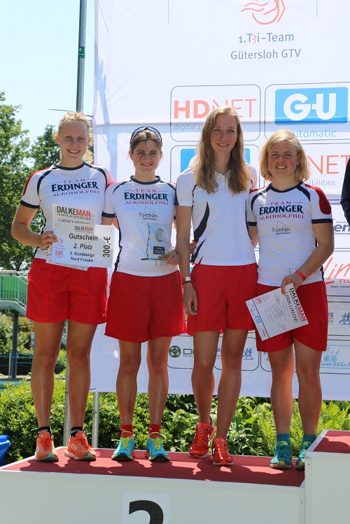 Diesen Zusammenhalt hat man auch bei den Frauen direkt ab dem Beginn sehen können. Das Schwimmen lief gut. Auch wenn taktische Maßnahmen spontan vor dem Start umgestellt wurden, behielt unsere Schwimmerin Lea die ganze Zeit den Überblick und zog uns durchs Wasser, sodass wir nach 12:21 min auf unser Fahrrad springen konnten. Auch beim Radfahren übernahm sie das Kommando und brachte uns zum kreiseln. Mit 31:30 min konnten wir uns eine solide Radzeit erfahren und mussten jetzt beim Laufen alles geben. Der Kurs war teilweise ziemlich wechselhaft, da es schnelle Richtungswechsel und viele Kurven gab. Aber wir ließen uns nicht beirren und versuchten uns untereinander durch Zurufe und gegenseitiges Schieben zu motivieren. Die zweite Runde wurde dann nochmal hart, aber als wir merkten, dass wir eins der Verfolgerteams etwas abschütteln konnten, gingen die letzten 1,5 km gleich viel leichter. Pauline kämpfte uns mit einem letzten Schub Ziel und sicherte uns wichtige Sekunden. Mit einer Endzeit von 1:04:37 konnten wir uns ebenfalls den 2. Platz in der Teamwertung ergattern und sind mehr als stolz. Wir gratulieren den anderen starken Frauen- und Herrenteams zu den starken Leistungen und freuen uns auf die weitere Saison!