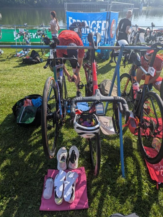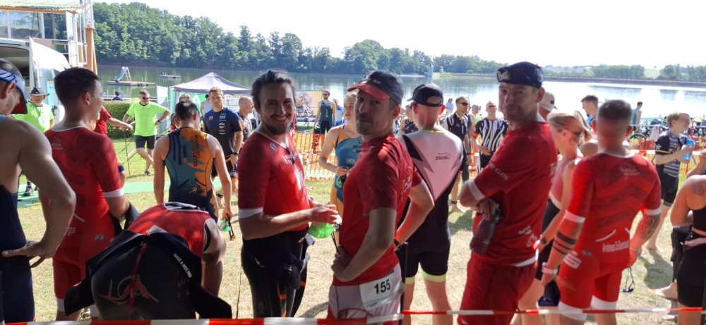 Das Rennen ist schnell erzählt: Pünktlich 10 Uhr feuerten die Werdauer Schützen aus allen Rohren und die Ligaraketen stürzten sich in die kühlen (Neo war erlaubt) Fluten. Zwei Minuten später waren die Büchsen nachgeladen und die 'restlichen' Athletinnen und Athleten, ich mittendrin, warfen sich ins Rennen. Ein Dreieckskurs, dieses Mal fehlten ein paar Meter, war schnell gemeistert und durch den Wechselgarten ab aufs Rad.