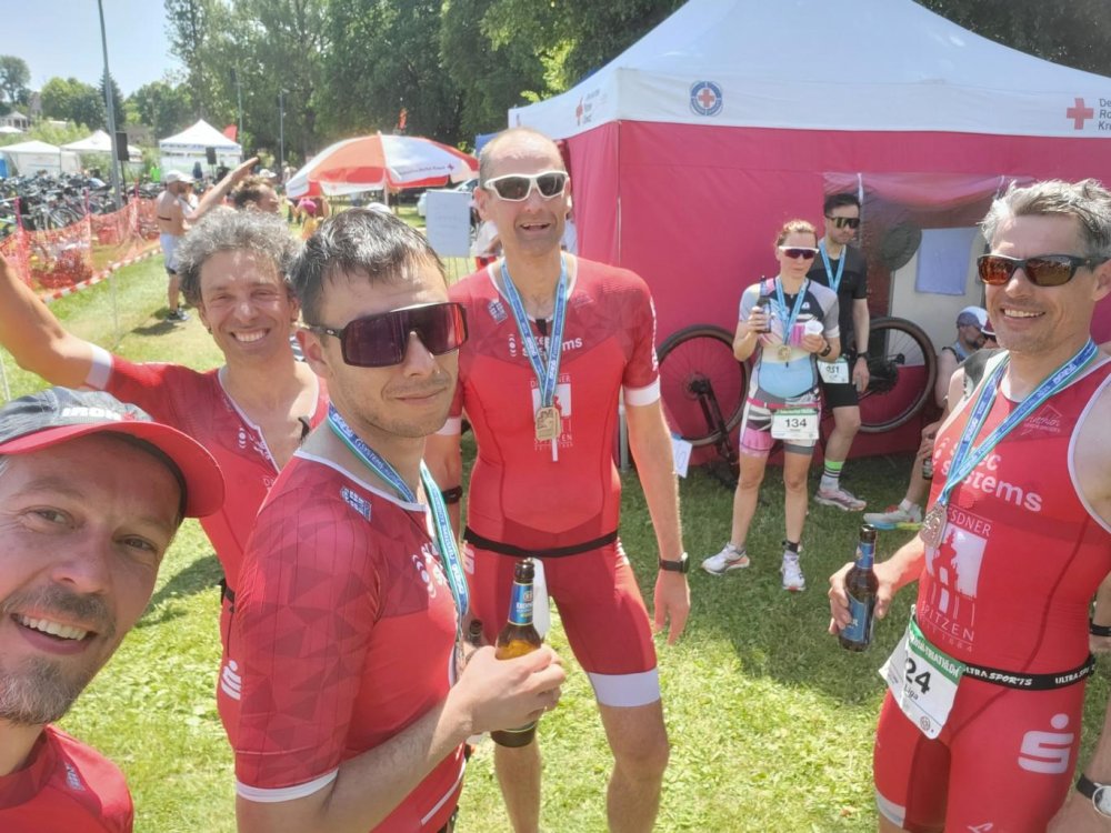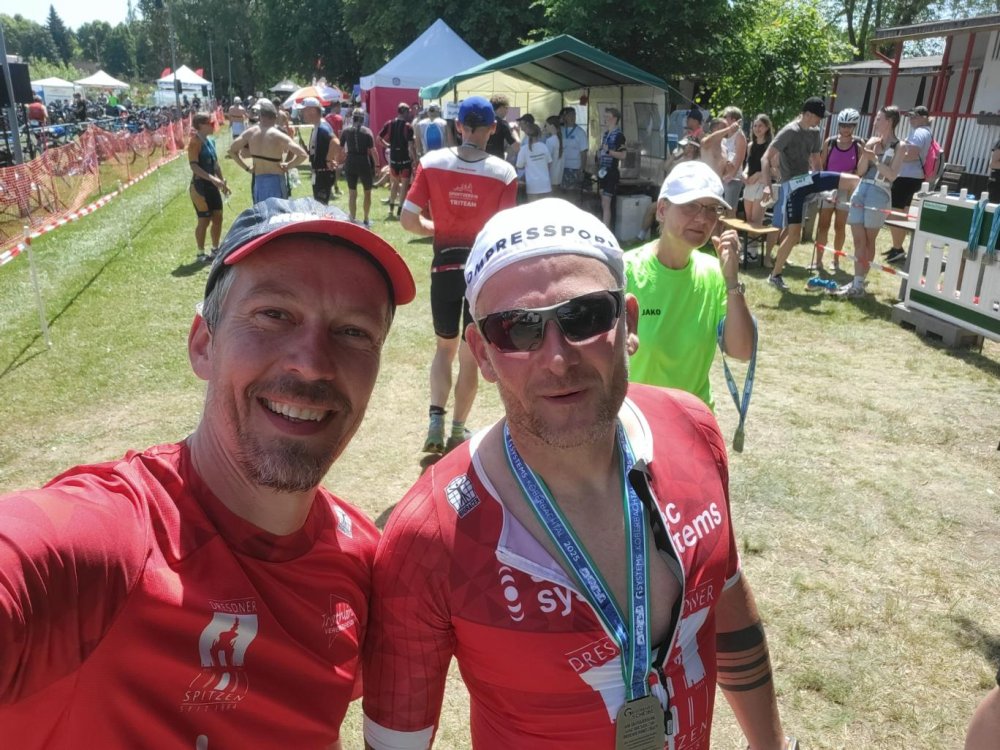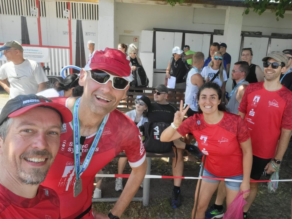 Der letzte Rennpart war nämlich fast ohne Schatten und mit steilen Rampen echt hart und da half ein Fixpunkt zum 'dran festbeißen', um nicht wie viele andere Athleten gehend zu enden. Kurz nach der ersten Runde kam dann noch Nico vorbeigerauscht - auch sichtlich gezeichnet aber flott unterwegs. Und so kamen wir dann mit kleinen Abständen zu dritt fast zur selben Zeit erschöpft aber glücklich im Ziel an.