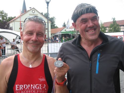 Erwähnenswert ist noch, dass Franzi Tiex Landesmeisterin Sachsen-Anhalt wurde, Thomas Röver 2. und 1. in seiner AK – das MTB-Training in der Dresdner Heide mit Susi und Torsten hat also nicht geschadet. In der Altersklasse M55 wäre ich Landesmeister Sachsen-Anhalt, wenn ich dann dafür startberechtigt gewesen wäre, der Geburtsort zählte leider nicht L. Im Gegensatz zu Sachsen (Koberbachtalsperre) gab es bei der Landesmeisterschaft auch eine Siegerehrung. Auch sonst war es ein sehr gut organisierter Triathlon. Wer sich nicht vor der langen Anreise scheut, dem sei diese Veranstaltung ausdrücklich empfohlen. Aber bitte rechtzeitig anmelden, es werden nur so viel Starter angenommen, wie auf einmal auf den Dampfer passen.