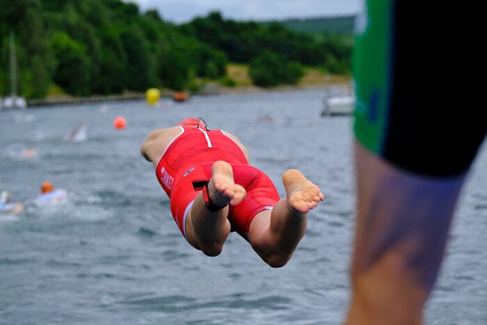 Das Schwimmen begann mit einem kühnen Sprung ins Naße.