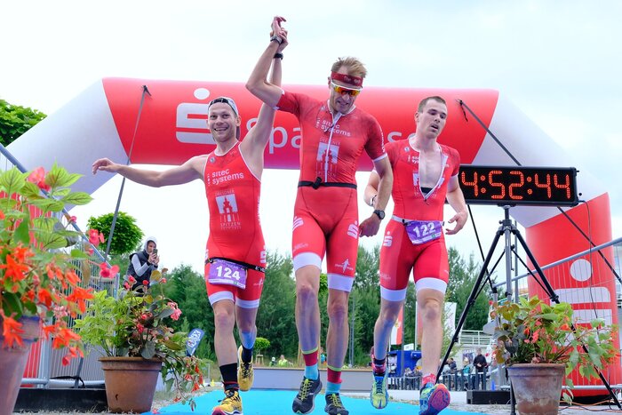 Mit breiten Grinsem und erschöpft erreichen Max, Grahlo und Tim das Ziel.
