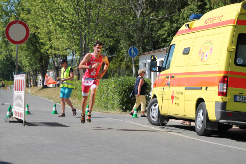 In der Wechselzone dann das Rad abstellen, Helm ab und Schuhe an. Auch der 2. Wechsel verlief wie am Schnürchen. Dann raus auf die Laufstrecke. Zuerst runter an den Fuß der Sperrmauer, um dann in einem langen Bogen bei praller Sonne einen Hügel zu erklimmen.