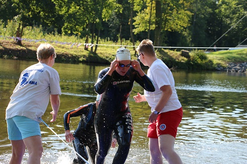 In der Mulde durfte mit Neo gestartet werden und das war auch gut so, denn es war frisch. Diesmal ging ich deshalb auch gleich mal Einschwimmen, denn der Neo hielt ja warm im Nachgang. Das Startprozedere mit Vorstellung und Musik und dem ganzen Tam-Tam war eigentlich ganz spannend. Dann durften alle ins Wasser und sich Ihre „Start-Box“ suchen. Und ab die Post! Die ersten Züge liefen noch ganz gut, aber dann kamen Arme und Körper von links, recht und hinten und nach ein paar Sekunden diesen Zustandes machte sich leichte Panik bei mir breit. Ich bin sowas halt nicht gewohnt. Nach einer Weile inkl. ein paar Züge Rückenschwimmen habe ich mich dann aus dem Gewühle zur Flußmitte hin herausgekämpft und so sicher ein paar Meter mehr absolviert und auch mit etwas mehr Strömung zu kämpfen gehabt, aber immerhin konnte ich die zweite Hälfte des Schwimmens so noch etwas angenehmer gestalten und ab der Wende auch noch ein paar Plätze zurückholen.