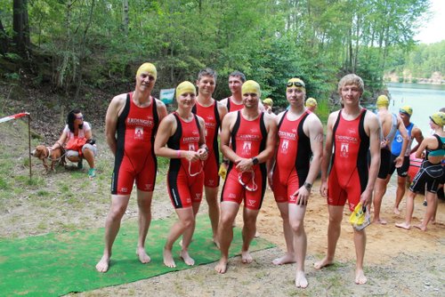 Nachdem das erledigt war ging es an den Schwimmstart. Hier fand noch kurz eine Wettkampfeinweisung statt bevor es zum einschwimmen ging. Der Landesligawettkampf ging über 800m Schwimmen und 8.000m Laufen. Neu war dieses Jahr das Schwimmen über 2 Runden mit kurzem Landgang.