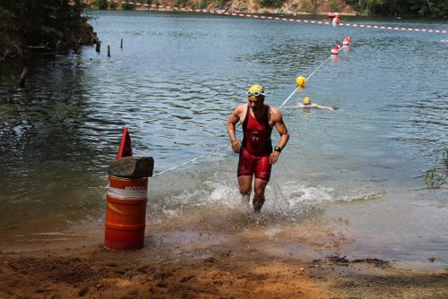 Als ich mit Sophia am Wettkampfort ankam, war der 1. Wettkampf, ein 2.000m Langstreckenschwimmen, bereits im vollen Gang. So haben wir hier noch das Ende angeschaut und anschließend fand die Vorbereitung der Wechselzone statt. Diese gestaltet sich bei einem Swim & Run recht übersichtlich, da eigentlich nur die Laufschuhe + Socken bereit zu stellen sind. Dazu kamen nur noch Schirmmütze, Brille, Startnummernband und 1 Handtuch um die Füße trocken zu legen.