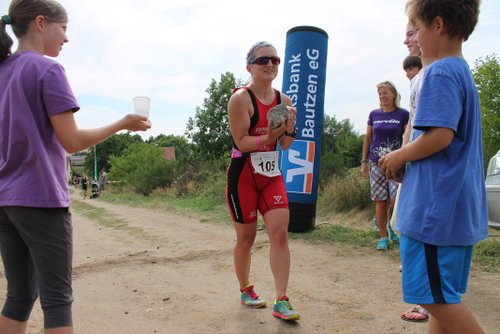 Nachdem es durch ein kurzes Waldstück auf die Straße ging konnte ich einen Großteil der vor mir befindlichen Athleten sehen, die offenbar nahezu zeitgleich aus dem Wasser sind. Mit der Zeit dehnte sich diese Feld und ich konnte dank guter Laufleistung einige Plätze gut machen. Die beiden Runden gestalteten sich dabei recht konstant, so dass ich mich am Ende über einen 12. Platz freuen konnte. In gewohnter Manier durfte man dann im Ziel gleich einen schweren Pflasterstein als Trophäe in die Hand nehmen um sich über die 53 Minuten, die man teilweise bei Hitze und ohne Schatten hinter sich bringen konnte, angenehm zu freuen ;)