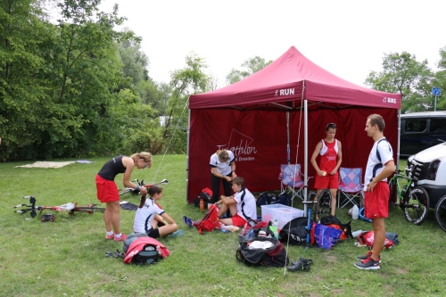 Die Männer waren zuerst dran. Martin sprang zwar für Grahlo ein, aber so richtig Lust hatte er wohl doch nicht und ließ seine Radschuhe gleich zu Hause. So entschied er sich, Andi Koch beim Schwimmen zu unterstützen. Die Schwimmstrecke der Olympischen Distanz führte durch den Hafen raus auf die Havel, einmal um die Spülinsel und dann wieder raus aus dem kühlen Nass. Danny und Andreas Jalowi kamen gut in den Fluten zurecht und im vorderen Drittel aus dem Wasser. Nico, Andi Koch und Martin verweilten noch etwas in der Strömung und folgten im Mittelfeld. Es folgte eine 22 km lange Wendepunktstrecke, die 2-mal gefahren werden musste. Fahrerisches Können war hier nicht gefragt. Hier konnten die punkten, die Druck auf die Pedale bringen können. Vor allem Nico konnte sich hierdurch nach vorne arbeiten und durch einen sehr guten Lauf den 9. Platz erkämpfen. Danny war da nach den 3 Laufrunden schon knapp 50 Sekunden auf Platz 6 im Ziel. Andreas Jalowi büßte auf dem Rad etwas ein, aber kämpfte sich durch einen guten Lauf wieder auf den 14. Platz. Andreas Koch folgte auf dem Platz 18. Diese Leistung bescherte der Männermannschaft wieder den 2. Platz in der Tageswertung hinter den Dauersiegern von TVB 09 und auch in der Gesamtwertung setzen sie sich hinter ihnen auf den 2. Platz fest.