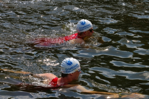 Wir durften dann nun auch endlich 15:50 Uhr über die Sprintdistanz ran. Nach dem Einschwimmen „stellten“ wir uns an der gedachten Startlinie zwischen zwei Bojen auf, warteten noch auf ein Paddelboot, was sich auf die Schwimmstrecke verirrt hatte, und dann ertönte auch schon die Starttröte. Ich stellte mich ganz vorne mit auf, um so wenig wie möglich zu verlieren. Leider bekam ich nach wenigen Metern einen Fußtritt gegen den Kopf, später verschluckte ich jede Menge von dem spritgeschwängertem Hafenwasser, was mich etwas aus dem Rhythmus brachte. Glücklicherweise hatte ich Pauline zu mindest bis zur Wendeboje immer im Blick, was mich positiv stimmte. Wir blieben im Hafen, wendeten also an der Boje und schwammen wieder entlang der Boote Richtung Ausstieg. Durch die Strömung erschien der Rückweg etwas länger. Gegen die starken Schwimmerinnen haben wir nix entgegenzusetzen. Fast geschlossen kamen wir aus dem Wasser: Pauline als 14., ich als 17., Manu als 19. und Jule als 20.