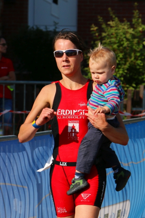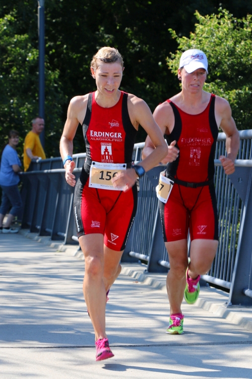 Vorsichtig die Badekappe runter, schließlich durfte die tolle Frisur nicht zerstört werden, ab zum Radel, Helm auf, Nummer um und rauf aufs Rad. 11 km hin und 11 km zurück…ziemlich unspektakulär! Da mir in der Wechselzone nicht gesagt wurde, auf welcher Position ich mich befinde, sah ich erst kurz vorm Wendepunkt, wie viele noch vor mir waren. Als 2. ging ich auf die Laufstrecke. Manu hatte auch gut Druck auf der Pedale und folgte nur 1,5 min später. Pauline und Jule, die von ihrer ersten Langdistanz vor einer Woche ziemlich schwere Beine hatte, folgten fast zugleich nochmal 1,5 min nach Manu. Wir hatten 3 kleine Hafenrunden zu laufen, also 6,3 km. Für mich waren die, wie immer sehr hart. Manu und Pauline laufen immer super, also kam es auf mich drauf an. Mich überholten aber nicht so viele und davon nur eine von den TuS (sen). Kurz vor Schluss kam dann auch noch Pauline, so dass wir als 6. und 7. Hand in Hand jubelnd ins Ziel laufen konnten. Für mich war klar, dass es dieses Mal reichen musste. Manu war als 3. eingelaufen und blieb damit sogar vor der ersten TuS (se). Jule schloss unser super Mannschaftsergebnis mit einem hervorragenden 11. Platz ab. Und tatsächlich, wir durften uns ganz nach oben auf‘s Treppchen stellen. Damit bescherten wir Manu ihren ersten Sieg mit einer Mannschaft in der Regionalliga! Nicht nur unser Sieg war es, was uns so happy gemacht hat, sondern auch, dass die Mädels von SCC Berlin sich noch vor die TuS (sen) von Berlin Neukölln geschoben haben. Somit sind wir punktgleich mit ihnen und der letzte Wettkampf wird die Entscheidung bringen. Wir sind auf jeden Fall jetzt schon heiß auf den spannenden Kampf!