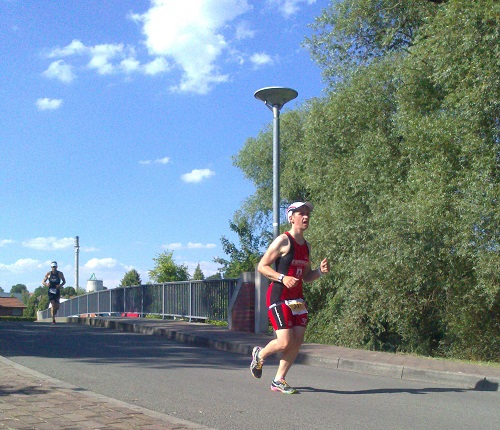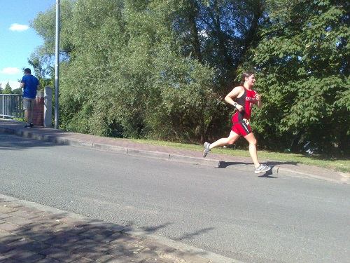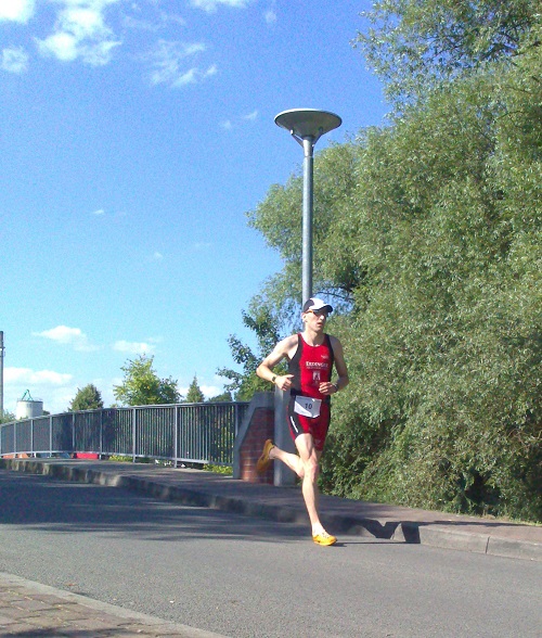 Bei sonnigen 35°C beginnt der Wettkampf mit dem Rennen der Männer. Kaum hat der arme Ligabeauftragte, der den Start runterzählen muss „Drei“,gesagt, brodelt und spritzt die Havel. Meine Orientierung sind zunächst Bozis Füße, die sich aber immer mehr im trüben Braun verlieren, bis ich irgendwann kaum noch seine Arme sehe. Dahinter folgen uns Grahlo, Andi und Carsten in ein bis zwei Minuten Abstand. Jörg kommt unter den ersten aus dem Wasser und es braucht einige Zeit, bis ich ihn nach einem kleinen Verfahrer auf dem Rad eingeholt habe. Von diesem Ereignis motiviert, versuche ich trotz einsetzendem Reizhusten ein zügiges Tempo zu fahren. Grahlo, Andi und Carsten kurz nach den Wendepunkten befeuern nochmals meine Leidenschaft. Auf der 20km Wendepunktstrecke ist einiges los, als noch Frauen und Masters dazustoßen. Jetzt heißt es Abstand halten und keine Scheu vor Überholmanövern. Andi und Carsten werden leider jeweils mit zwei Extraminuten belohnt.