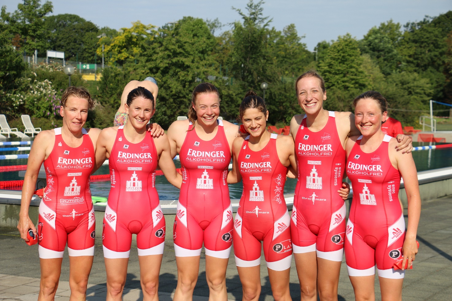 Ergänzung: die Männer des Dresdner Spitzen Triathlon Teams absolvierten ihr Rennen für die 2. Triathlon-Bundesliga zeitgleich. Die Starter waren: Björn Scheibner, Otto Junghannß, Marco Kühne und Robert Kuhne. Unterstützt wurden sie von Sophies Bruder Simeon Schumann. Beim Schwimmen schlug Max in 10:52 min als Erster des Teams an, gefolgt von Björn (11:25 min), Marco (12:05 min), Robert (12:44 min) und Otto (13:40 min). Das Laufen blieb bis zuletzt spannend. Am Ende setzte sich Björn in einer Zeit von 16:56 min durch. Otto benötigte 17:22 min, Max 17:40 min, Marco 17:55 und Robert 19:46 min für die 5000 Meter. Auch Simeon zeigte sehr starke Leistungen in beiden Disziplinen. Trotz der guten Leistungen, blieb im Endergebnis der Teamwertung „nur“ ein 15. Platz. Die beste Einzelplatzierung belegte Björn auf dem 44. Platz.