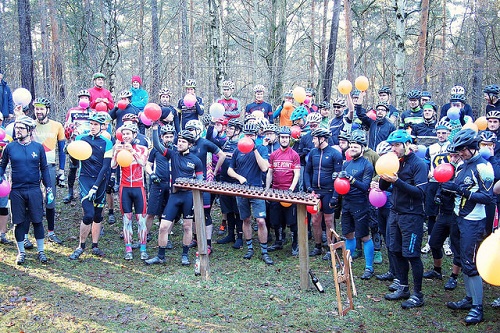 Dort empfing uns mitten im Wald der R.C.U mit einer Schnaps, -Bier und Kesksbar und einem sehr kreativ ins Unterholz gefrästen Singletrail. Der Rundkurs ließ unsere Herzen bereits bei der Erkundungsfahrt höher schlagen – nicht nur vor Anstrengung, sondern auch aus lauter Freude im herrlichen Morast spielen zu dürfen. Dreimal auf jeder Runde galt es einen schlammigen Bachlauf zu durchqueren. Mehrere Anstiege und Abfahrten verschiedenster Anforderungsstufen und lustige Hindernisse wie der „Limbo” im Bach und „2 Altschlauch-Recycling-Traumfänger“ versüßten die zu fahrenden acht Runden.